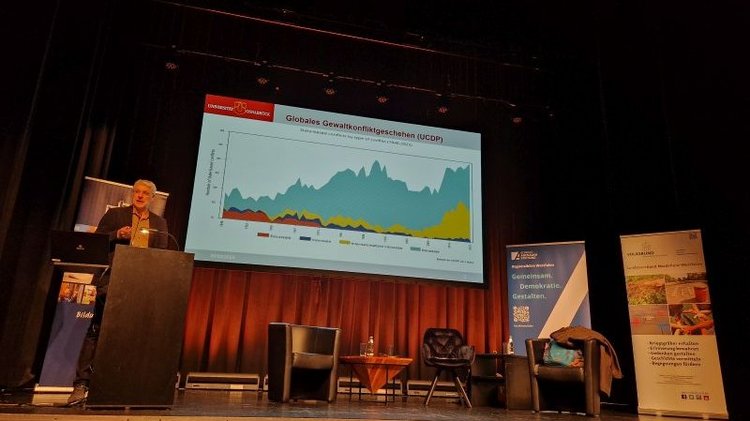Im zweiten Vortrag mit dem Titel „Krieg und (k)ein Ende? Das globale Konfliktgeschehen, Russlands Angriffskrieg und Perspektiven für Frieden“ nahm Prof. Dr. Ulrich Schneckener dagegen die aktuelle Situation auf der Welt in den Blick.
