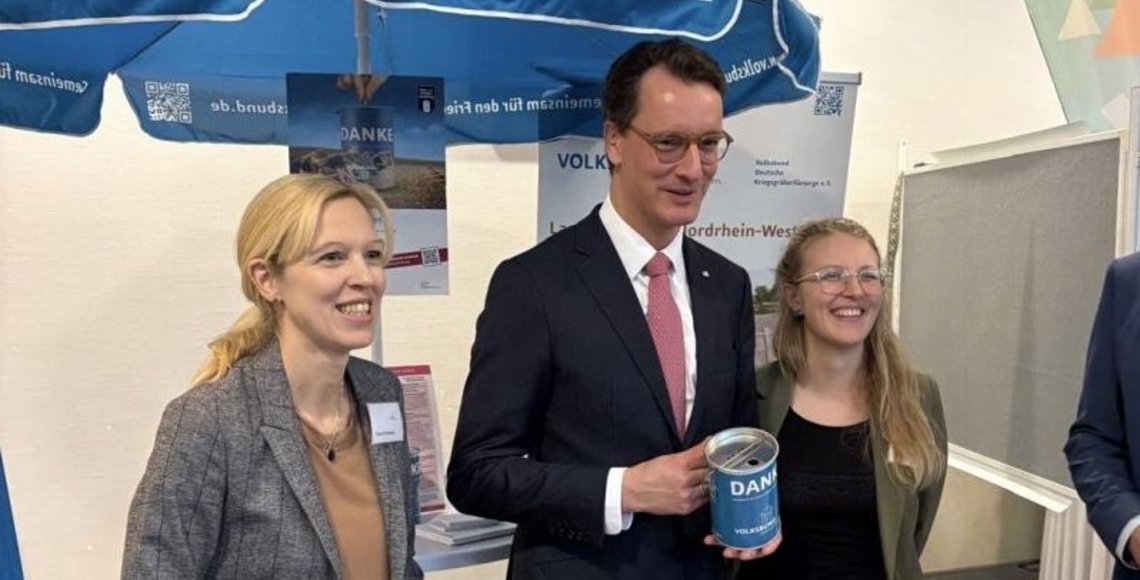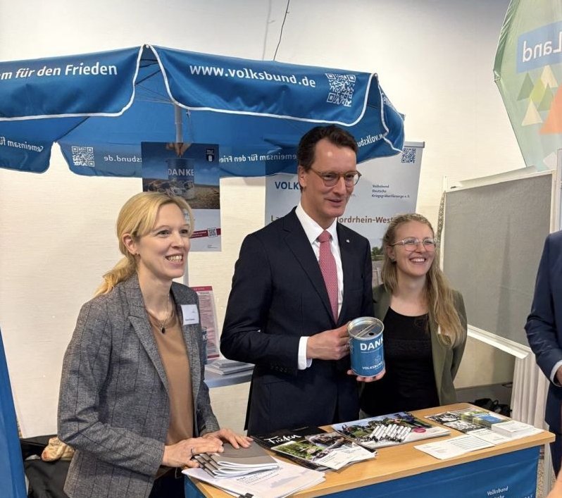 Ein Mensch, der das ganz besondere Engagement des Volksbundes in Nordrhein-Westfalen im Bildungsbereich gut kennt, ist der Ministerpräsident Hendrik Wüst. Er informierte sich trotzdem nochmals über die Arbeit des Vereins. Das Land Nordrhein-Westfalen unterstützt die Bildungsarbeit des Volksbundes über die Landeszentrale für politische Bildung. Um die Arbeit des Volksbundes darüber hinaus noch weiter zu fördern, griff er beim Info-Stand aber auch selbst zur Spenden-Sammeldose.